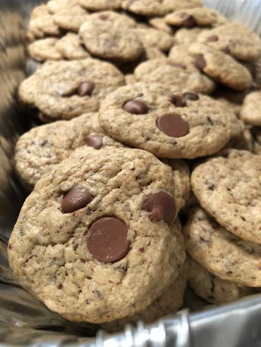 Bakery style, buttery chocolate chip cookies with semi sweet chocolate chips baked on the inside. Sold by as a platter of 25 count at .6 oz. each.