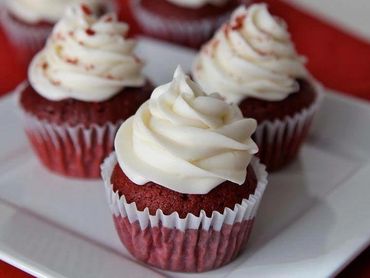 Moist red velvet cupcake topped with vanilla buttercream frosting, garnished with chopped pecans, crumbled cake or nothing at all.